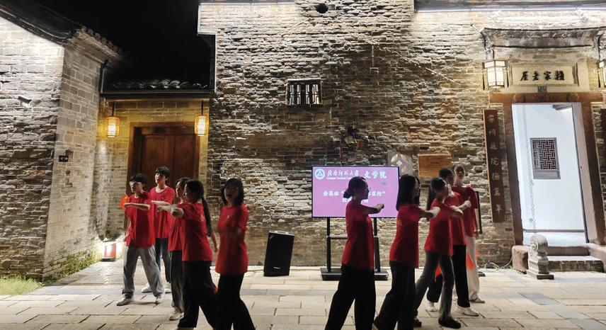 红色寻访团在夜晚时分来到戏剧小镇,并在这里进行文化汇演。通过手势舞,红色歌曲,戏剧表演,大合唱,诗歌朗诵等多种形式诠释红色精神的生命力。在手势舞环节,队员们用心表达对革命先烈的敬佩与感激;在红色歌曲和诗歌朗诵环节,队员们情绪高昂,无一不展现着当代青年的力量;在红色话剧环节,队员们通过生动的演绎,让观众深刻感受到革命岁月里红军战士们的英勇无畏和军民之间的鱼水深情。合唱和互动环节更是增添了观众们的参与感,大家共同回忆并感慨着革命年代的不易,更加坚定了走好当下路的决心。整场文化汇演不仅是对历史的致敬,更是对红色精神的传承与弘扬。