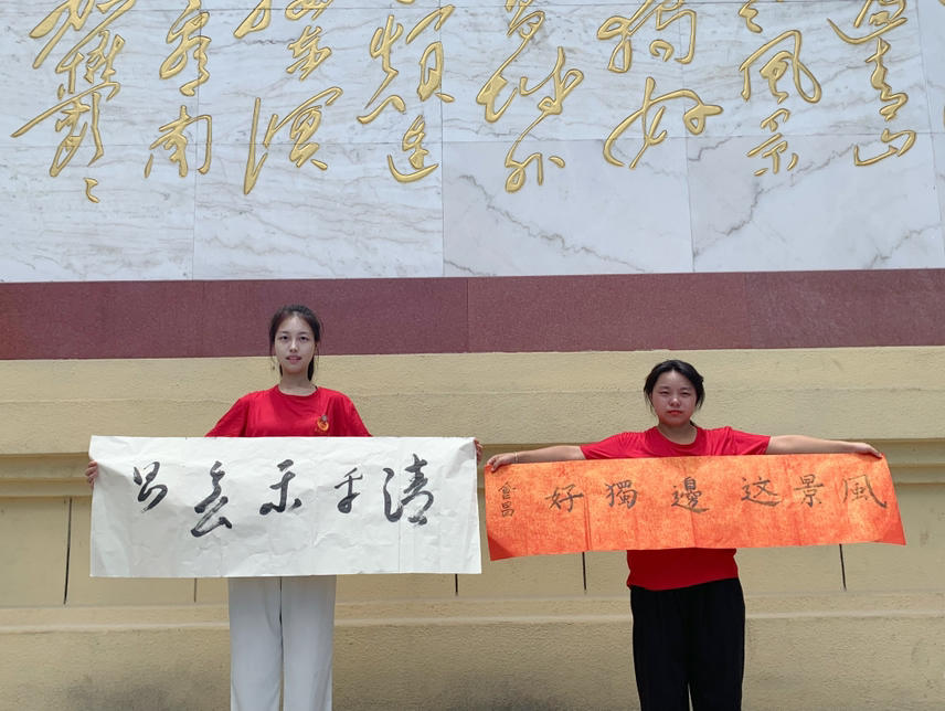 一笔笔起承转合,一条条横平竖直。7月5日上午,“薪火传承苏区行”红色寻访团到达会昌岚山公园。岚山公园内,鸟啼声声,绿树荫荫,花草相印,寻访团成员谢璐璐、张易若晨两人就地提笔。素纸轩墨,阳光洒落,再一次取下一方素宣,再一次看清水吻开笔墨,再一次笔锋在纸上浓墨轻描。一笔笔起承转合书写成一条条横平竖直,静逸中墨影成字。两人分别写下“风景这边独好”“清平乐会昌”,许是沐浴在这充满红色文化熏陶的气氛中,二人的心灵也感觉被冲刷洗涤,只剩一片澄澈。