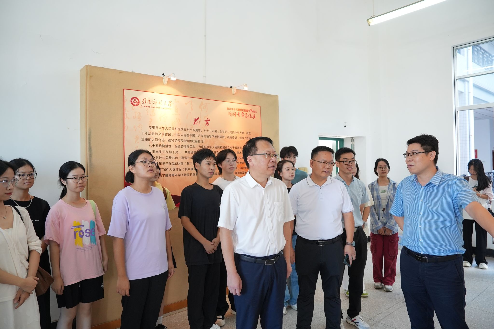 9月29日,喜迎中华人民共和国成立75周年——赣师青年书法展在绅士漫画 大学生人文科技中心二楼展厅成功举办。学校党委副书记刘民,学工处、团委、文学院负责同志共同观展。此次展览共征集全校青年学子作品684件(其中软笔作品165件,硬笔作品519件),经专家评委评审,遴选出了76件入展作品(其中硬笔50件,软笔26件)。